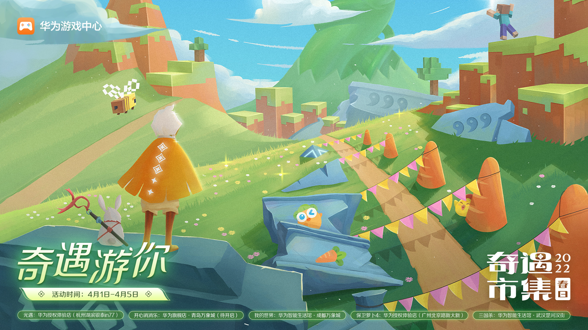 3月26日至4月5日,华为游戏中心携手《光遇》《开心消消乐》《我的世界》《保卫萝卜4》《三国杀》五款优质游戏在浙鲁川粤鄂五省千家华为体验店限时开启春日奇遇市集活动,为玩家..