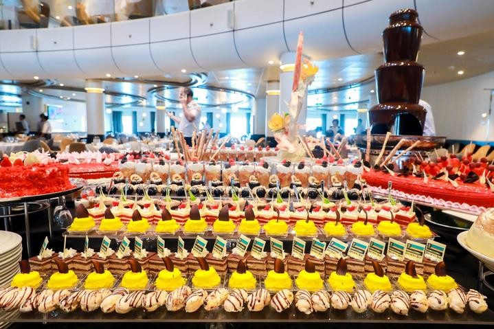种类齐全中西荟萃的主餐厅和帆船自助餐厅最受人喜爱,在帆船自助餐厅甚至可以DIY热狗汉堡,肉饼、芝士片、酸黄瓜,配料齐全,味道绝对正。
