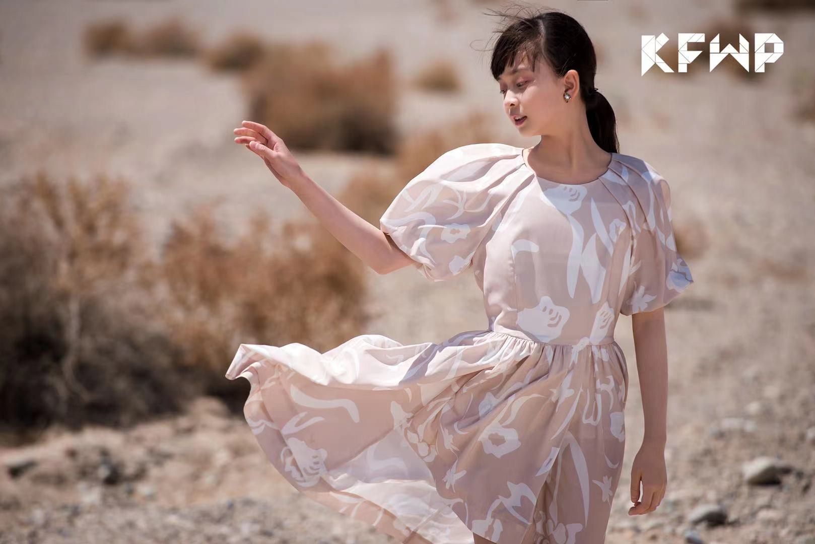 由设计师达子设计的,受梵高鸢尾花影响特别设计的印花,在戈壁中盛开,赞美自然,赞美艺术家们细致敏锐的观察、大胆的想象,在蔚蓝色天空的映衬下,大地色系的裙子,文静、优雅,如同在讲述着敦煌这片土地,丰厚灿烂的历史。
