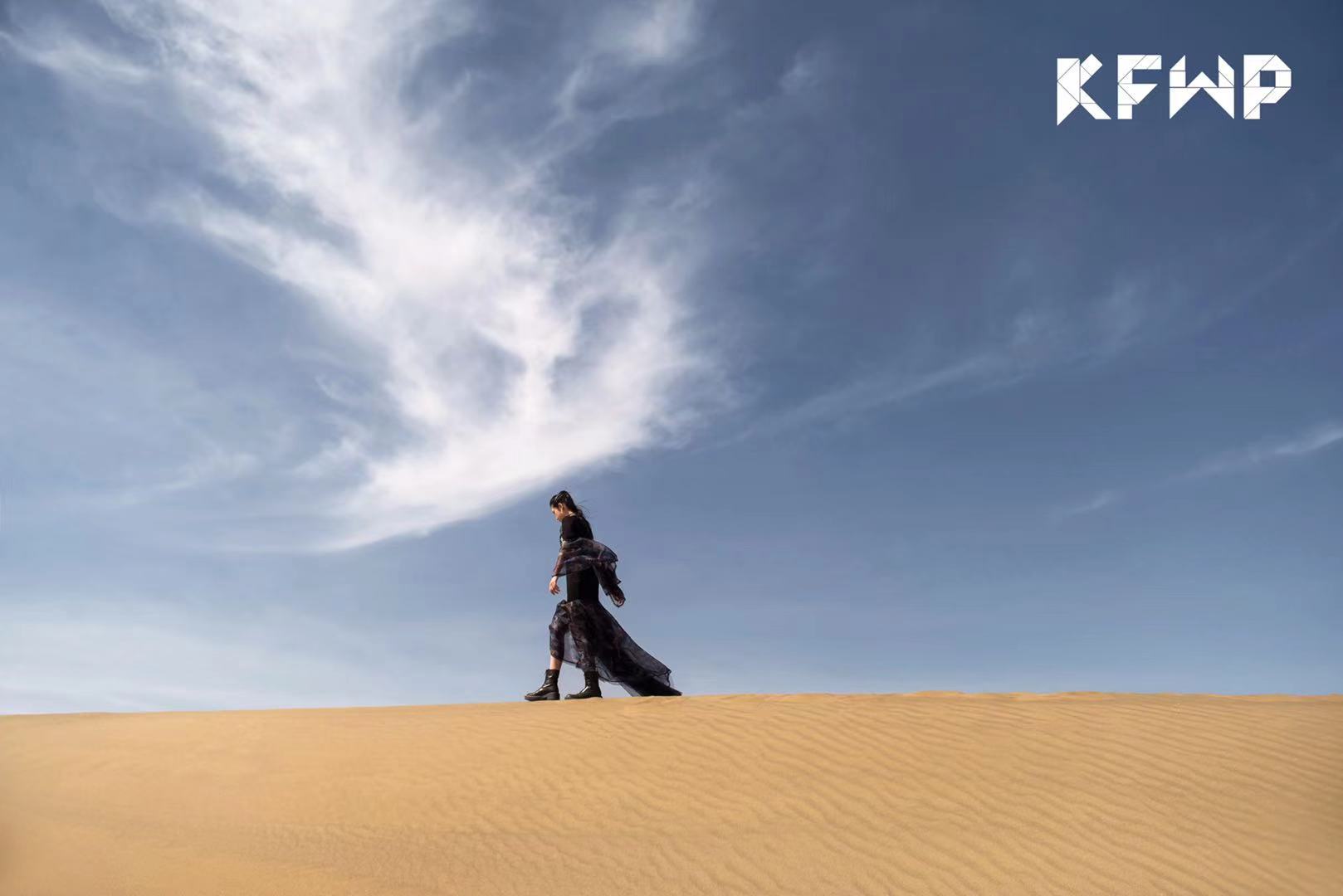 而达子设计的梵高·鸢尾花系列展现极简剪裁,凸显摩登意味,荒芜的戈壁环境更是让梵高的画中花显出瑰丽奇幻的美感,半身裙的小褶皱展现出少女们心境中的倔强,呈现勃勃生机。