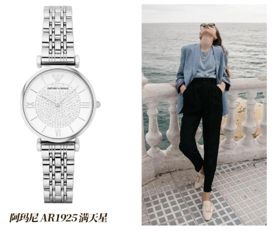 阿玛尼手表中火爆的要数跟佟丽娅同款的满天星系列了,广告词:“我愿意把星辰银河都送给你”,如此浪漫的标语和这款手表的颜值让这款手表一经问世就火热起来。