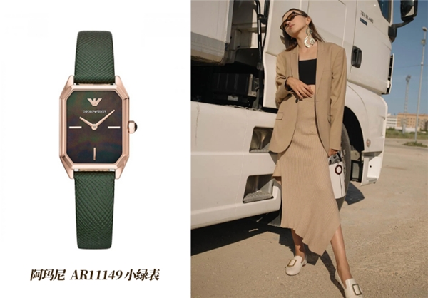 今天的重头戏是阿玛尼的“新宠”——阿玛尼小绿表,依旧是佟丽娅同款。其实近几年的大牌,都特别宠爱这种小方表的款式。因为比起高调张扬的暴发户式审美,这种温柔内敛、从骨子里散发出来的奢华,才是最戳人心的,就跟我们做人的道理一样,越简单越高级!