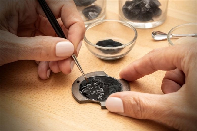 珐琅是一种由二氧化硅和氧化物混合而成的特殊材料。珐琅腕表的表盘需先经过润饰、硏磨和清洁等工序,再将未干的珐琅材料均匀涂刷,每一层的涂覆都必须精准,按照由浅至深、由暖色调到冷色调的顺序进行上色,后经800摄氏度以上高温烧制数百次,方得呈现多层珐琅叠加的自然光泽,显现深邃浓郁的色彩。每一轮烧制都伴随着风险,裂缝和瑕疵可能随时出现。匠师需实时监控窑内情况,精确掌握烧制过程,一丝差错都将影响最终成品。经过高温的洗礼后,珐琅表盘才会与金属基底融为一体,呈现出坚固而稳定的形态。历经千百年依旧色泽迷人。