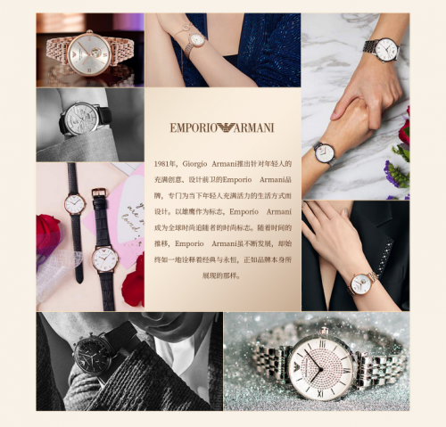 据相关数据显示,中国消费者最爱买的手表品牌中,时尚类占据了26%,同时,时尚潮流一直是手表里的永恒趋势,这个市场备受年轻人关注。阿玛尼作为欧洲顶尖的轻奢时尚品牌之一,推出的手..